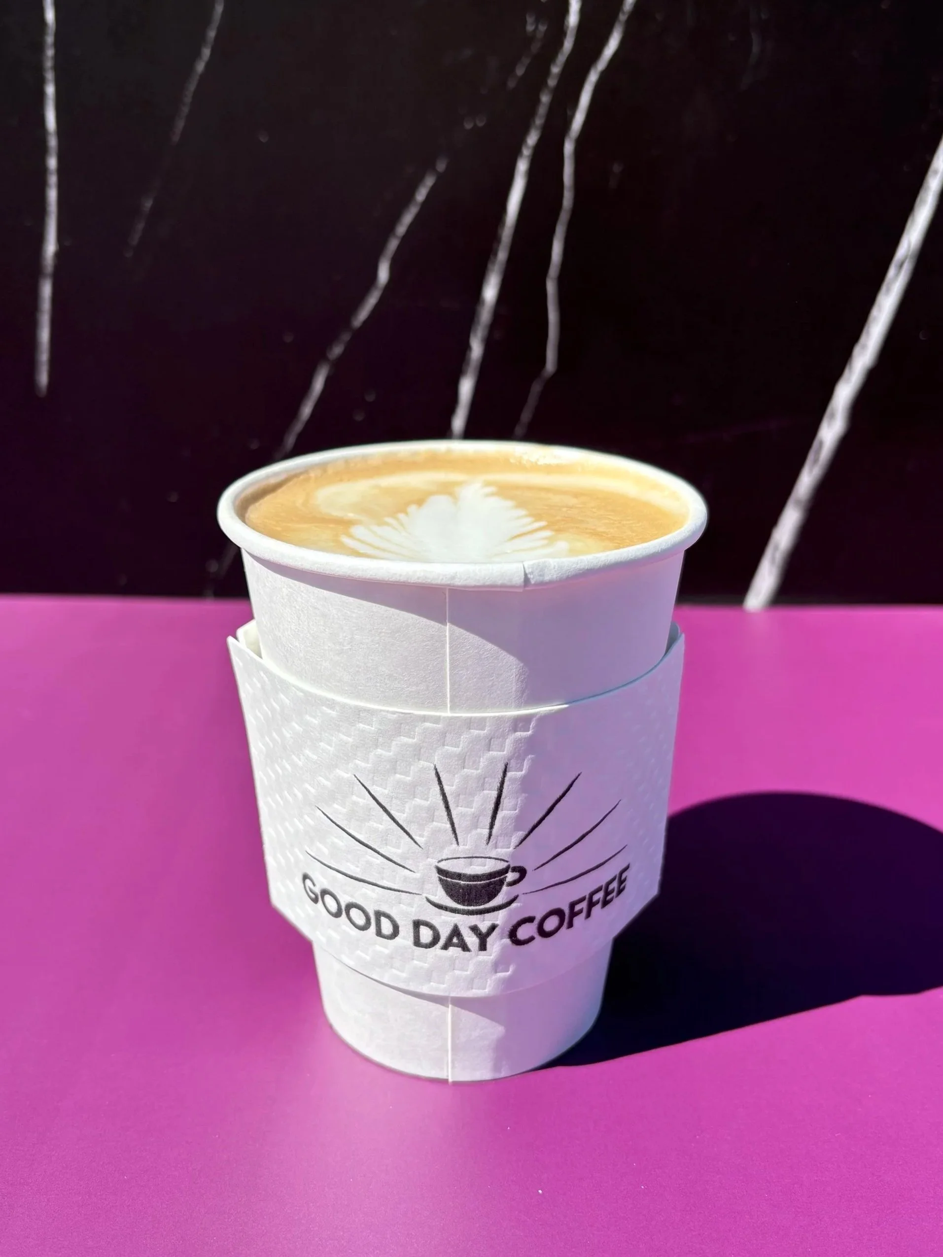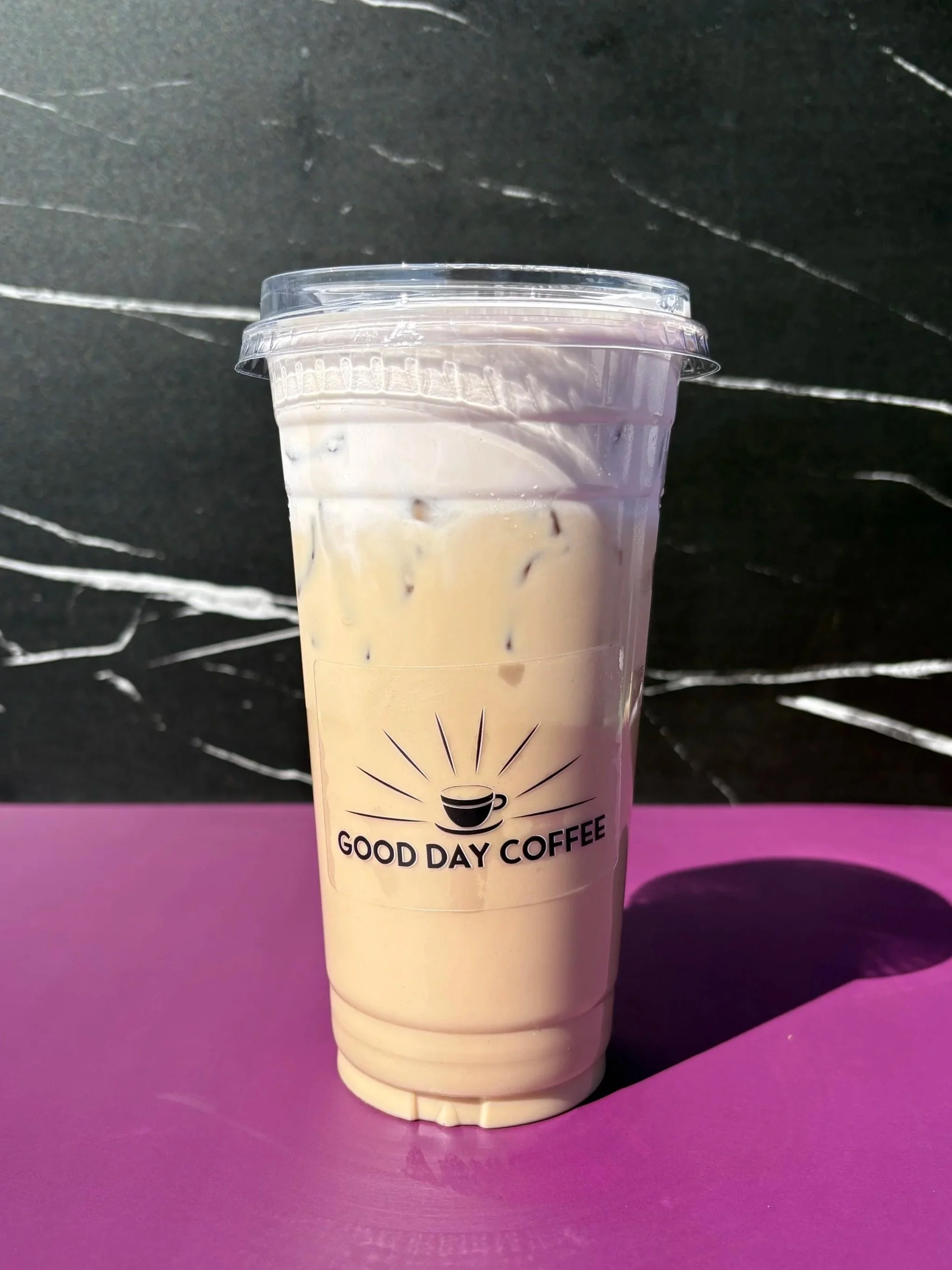 Hot or cold latte with lavender and vanilla syrup