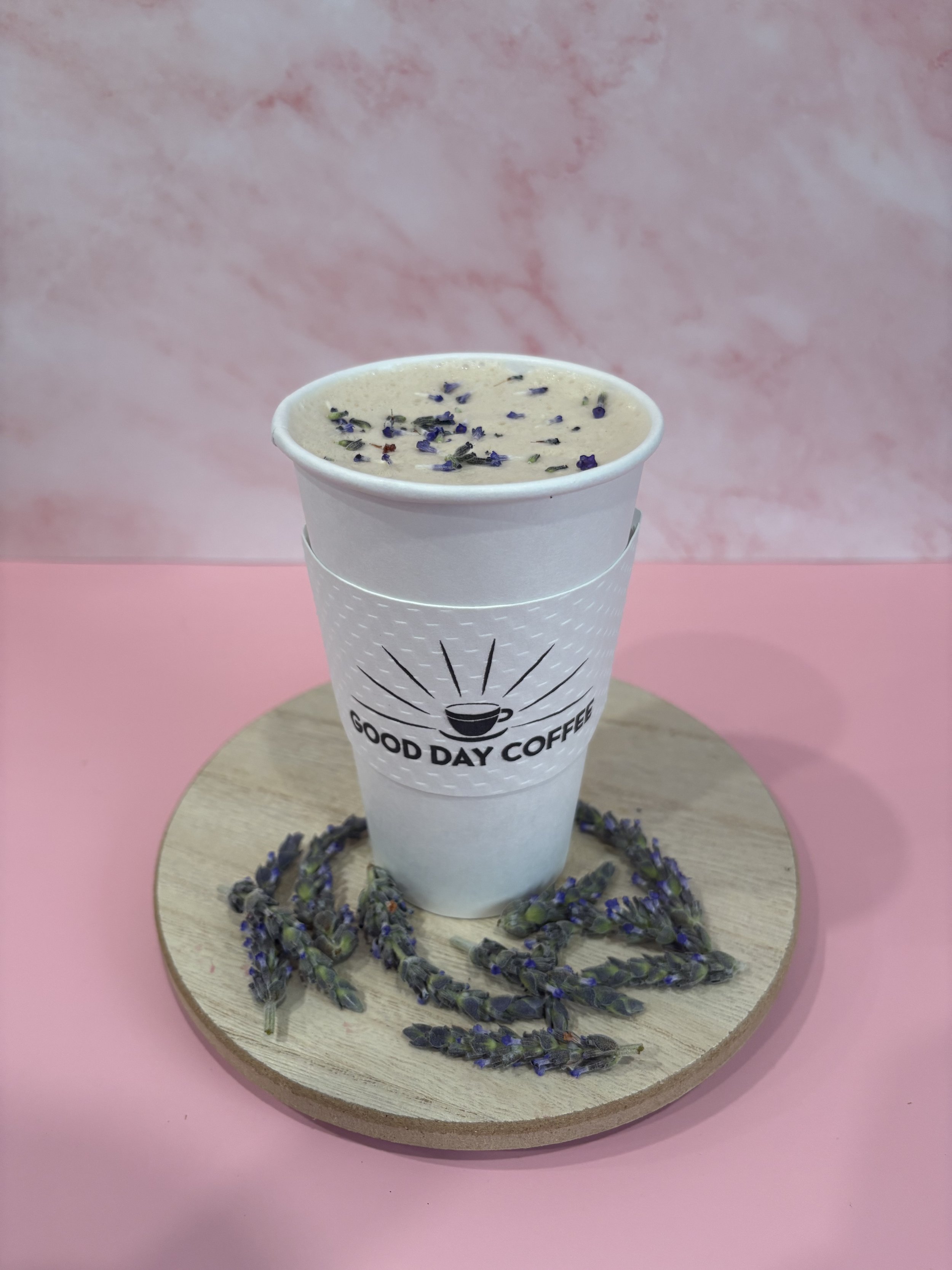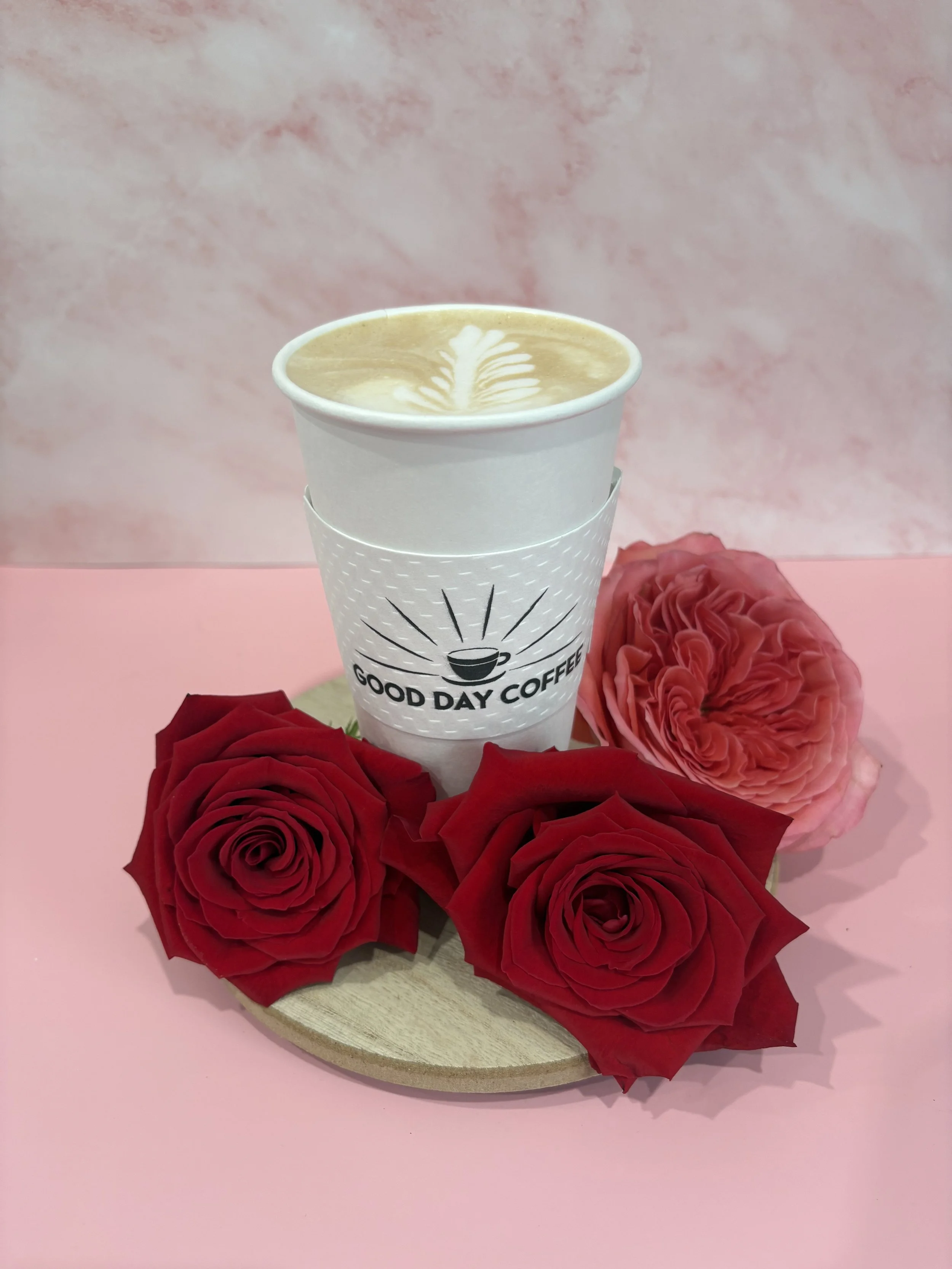 Hot or cold latte with rose and vanilla syrup