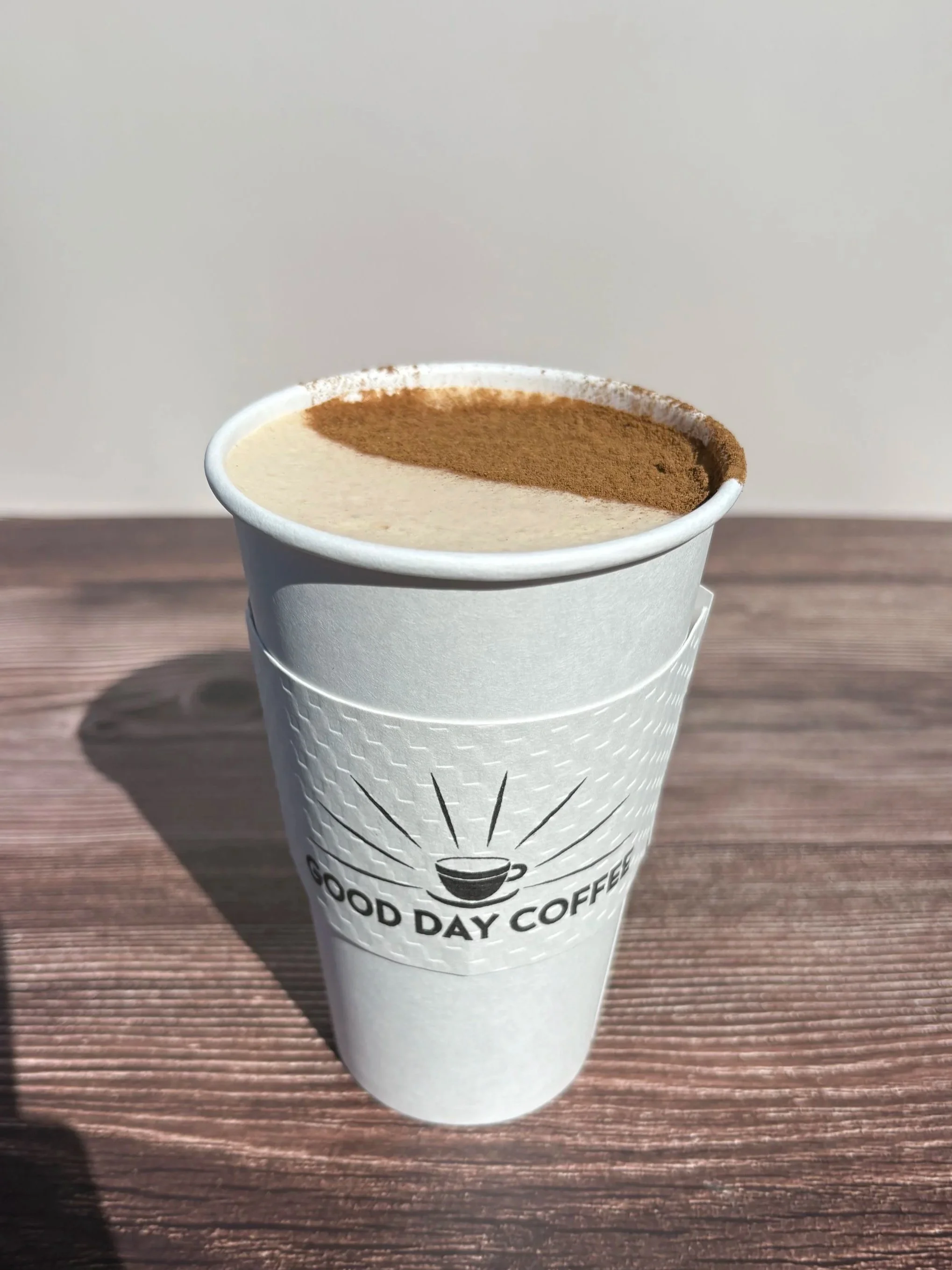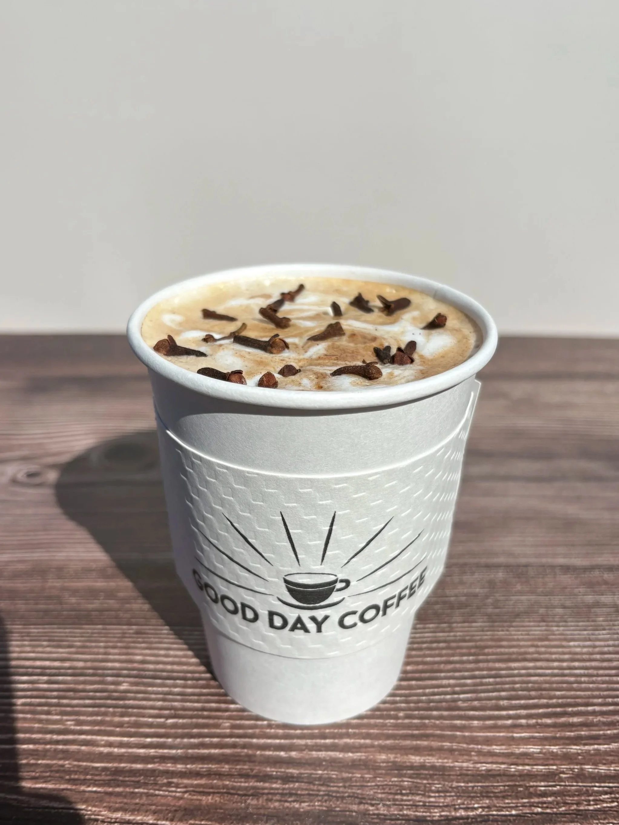 Hot or cold latte with vanilla syrup, cinnamon, ginger, cardamom and cloves